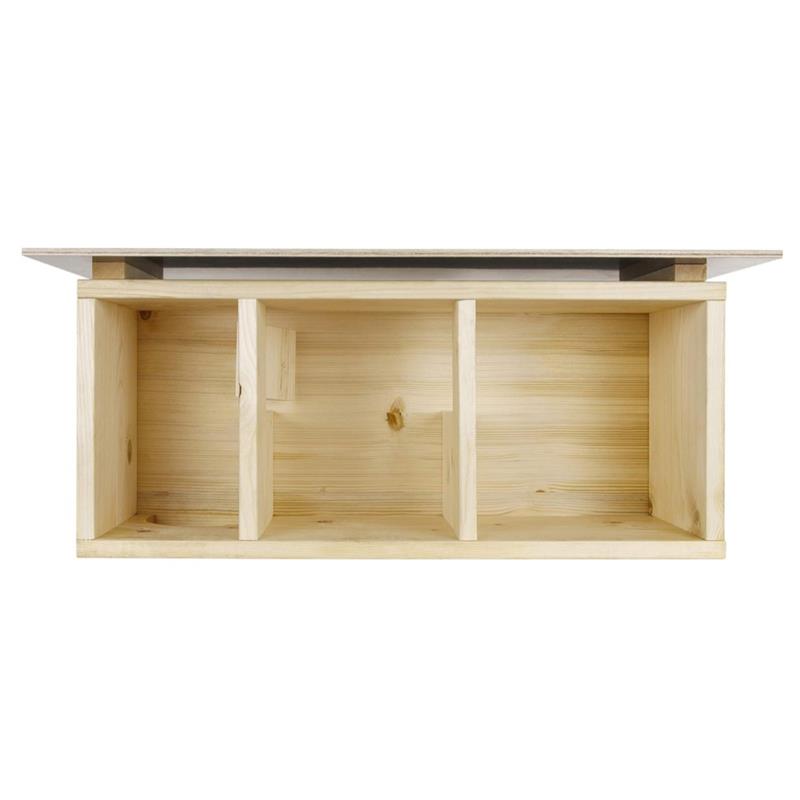 - hat drei Kammern somit sind Futter- und Schlafplatz getrennt: Eingangsbereich mit einem 12x12 cm großen Eingang, Futterraum mit einer Rattenklappe geschützt (Kammermaß: Länge 21 cm, Breite 26 cm, Höhe 27 cm) und Schlafplatz (Kammermaß: Länge 21 cm, Breite 26 cm, Höhe 27 cm)